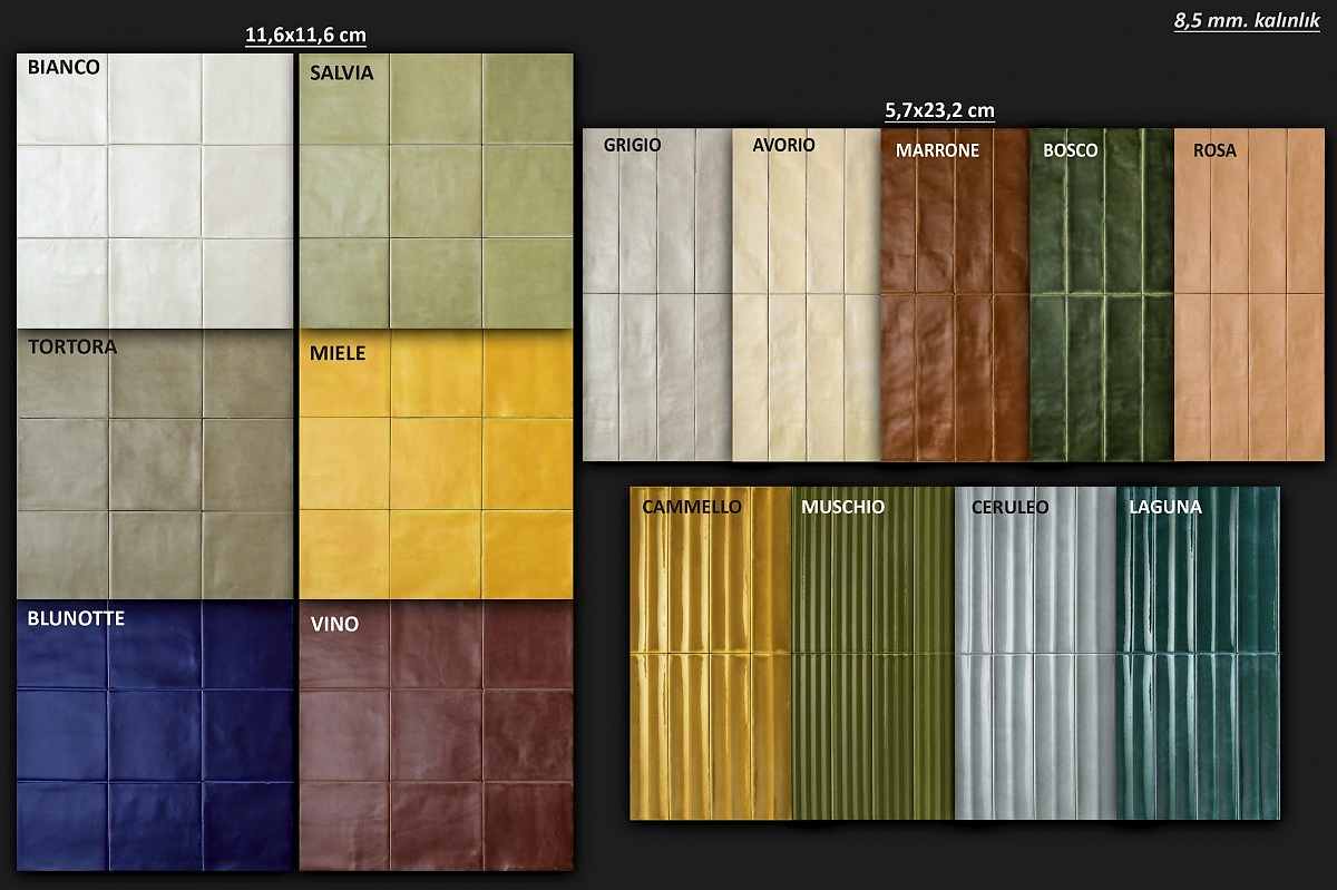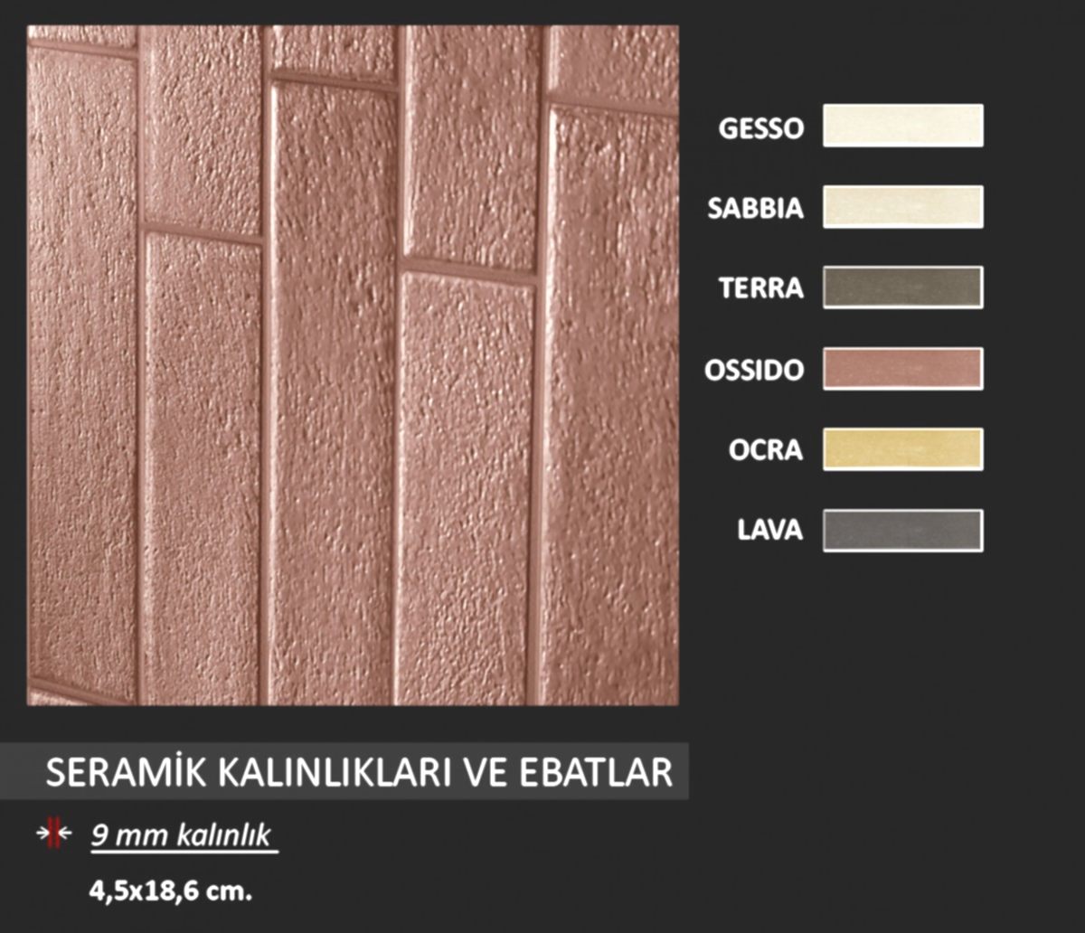 Çeşitli renk ve görünümlerde tuğla/brick tarzda İtalyan seramikler... Ebat ve renk seçenekleri için görsellere tıklayınız.